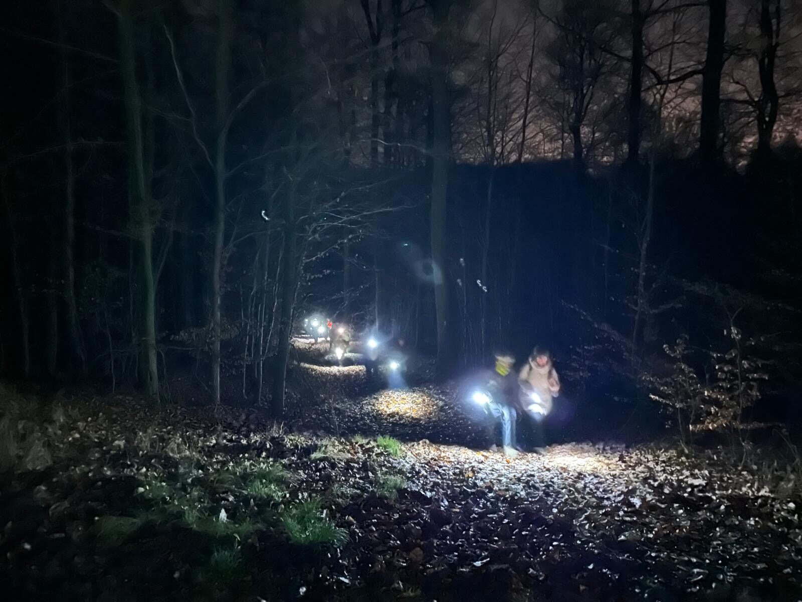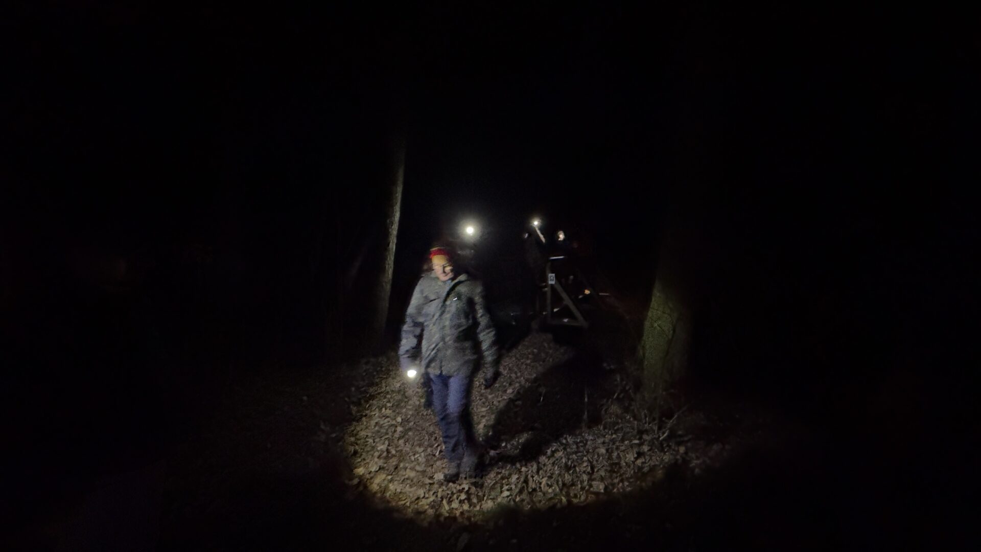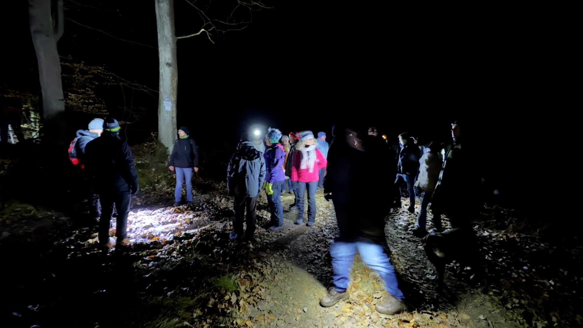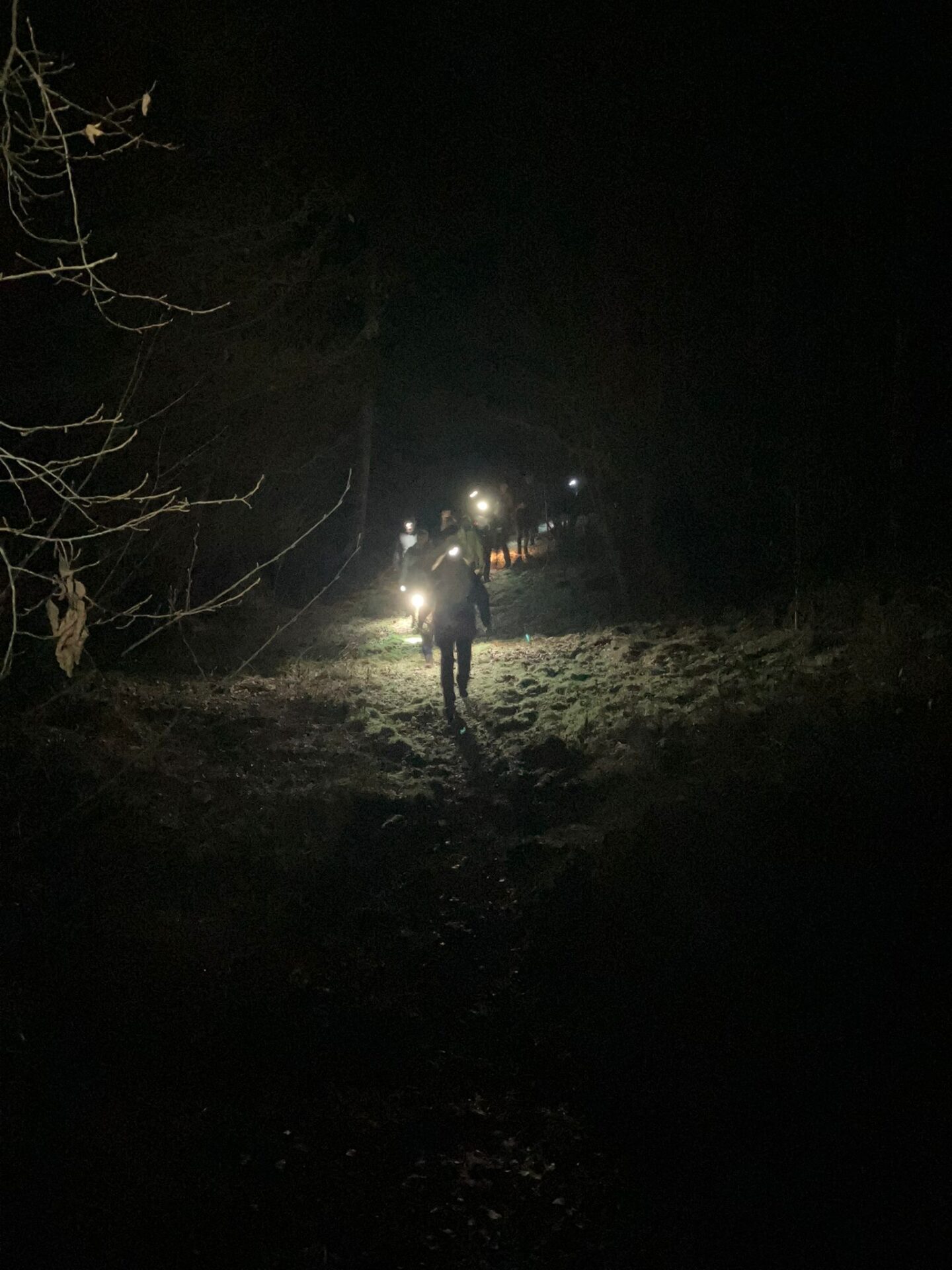 Bevor es weiterging, sorgte eine kleine Stärkung in Form von Stracker und Hochprozentigem, bereitgestellt von unserem Vorsitzenden Thorsten Brill, für zusätzliche Wärme. Danach wurde der Weg anspruchsvoller. Durch den Stadtwald in Richtung Seigertshausen war nun mehr Aufmerksamkeit gefragt. Die meisten waren mit Taschenlampen gut ausgerüstet, was sich als hilfreich erwies. Der Boden war gut angefroren, sodass wir wenigstens nicht im Matsch versanken. Eine abschüssige Wiese verlangte uns dennoch einiges ab. Wildschweine hatten hier ganze Arbeit geleistet und den Untergrund kräftig umgepflügt, sodass jeder Schritt bewusst gesetzt werden musste.
