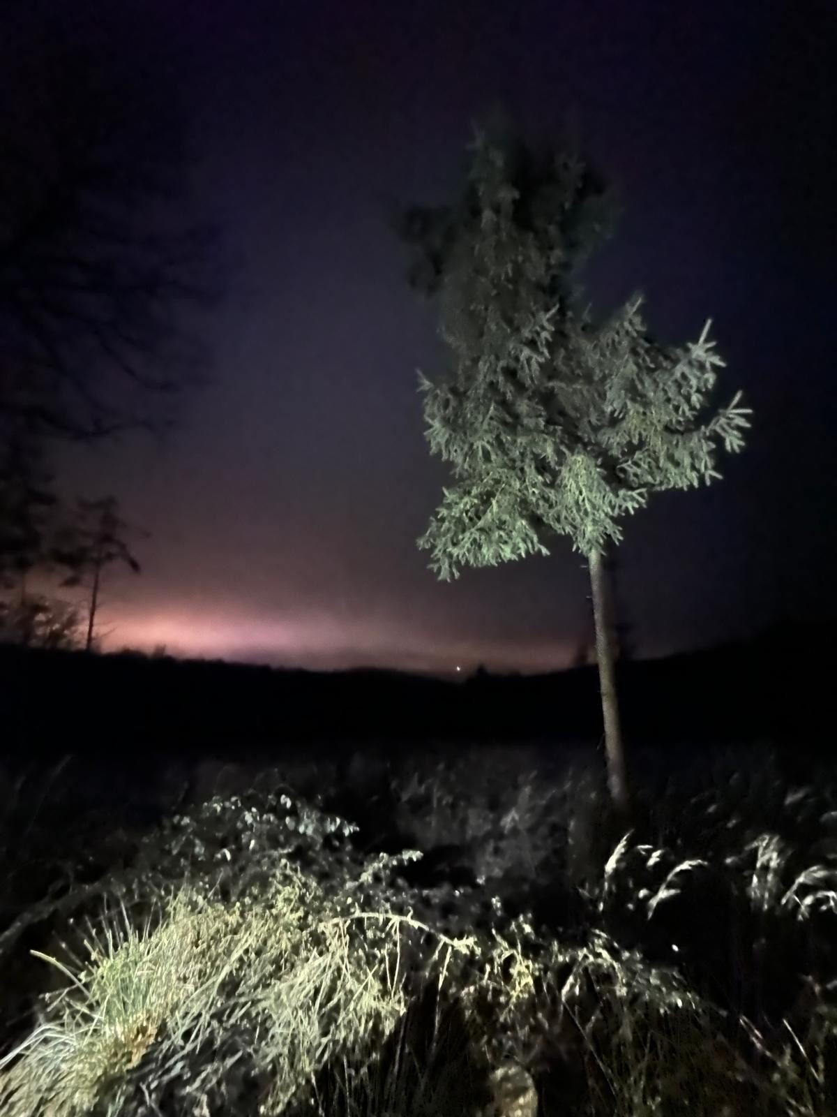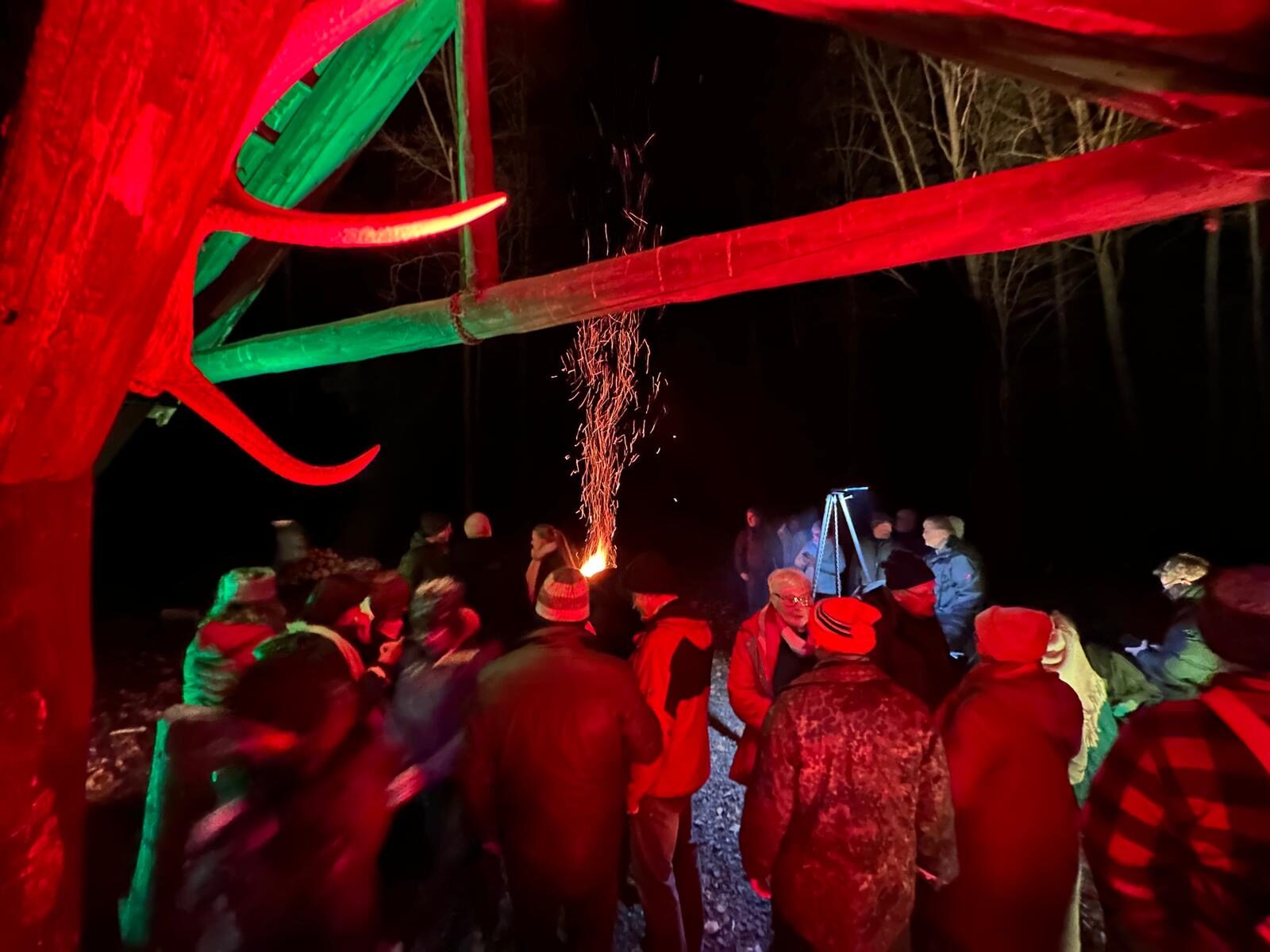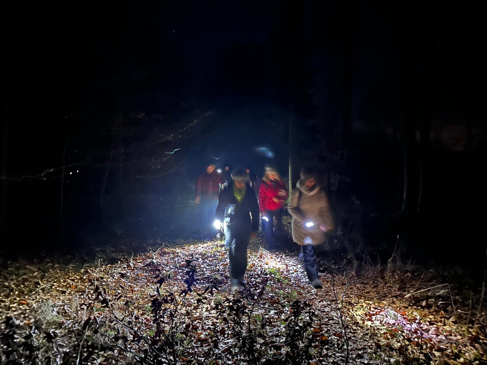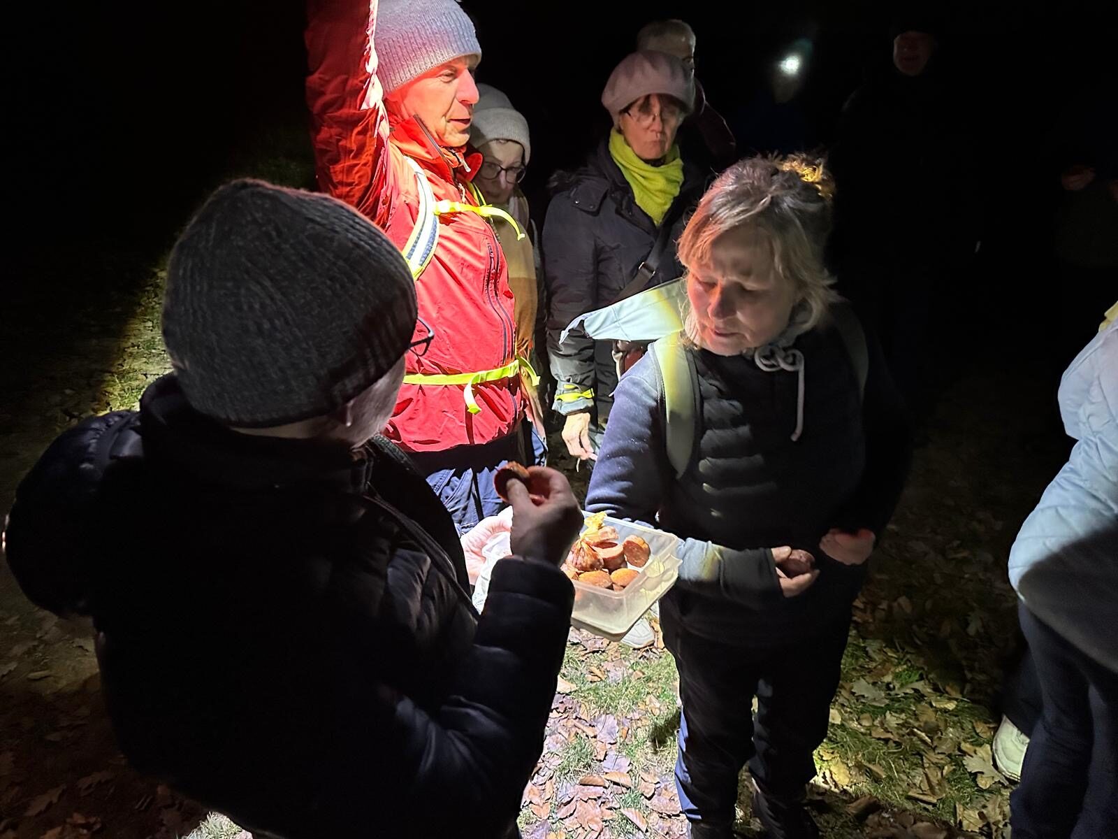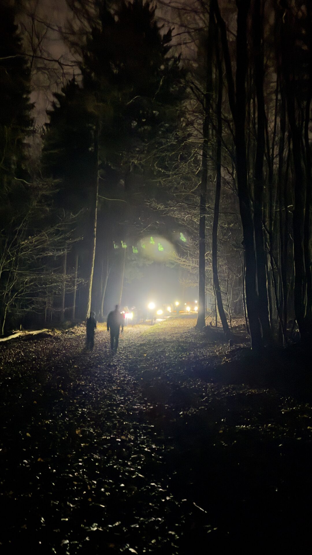 Bevor es weiterging, sorgte eine kleine Stärkung in Form von Stracker und Hochprozentigem, bereitgestellt von unserem Vorsitzenden Thorsten Brill, für zusätzliche Wärme. Danach wurde der Weg anspruchsvoller. Durch den Stadtwald in Richtung Seigertshausen war nun mehr Aufmerksamkeit gefragt. Die meisten waren mit Taschenlampen gut ausgerüstet, was sich als hilfreich erwies. Der Boden war gut angefroren, sodass wir wenigstens nicht im Matsch versanken. Eine abschüssige Wiese verlangte uns dennoch einiges ab. Wildschweine hatten hier ganze Arbeit geleistet und den Untergrund kräftig umgepflügt, sodass jeder Schritt bewusst gesetzt werden musste.