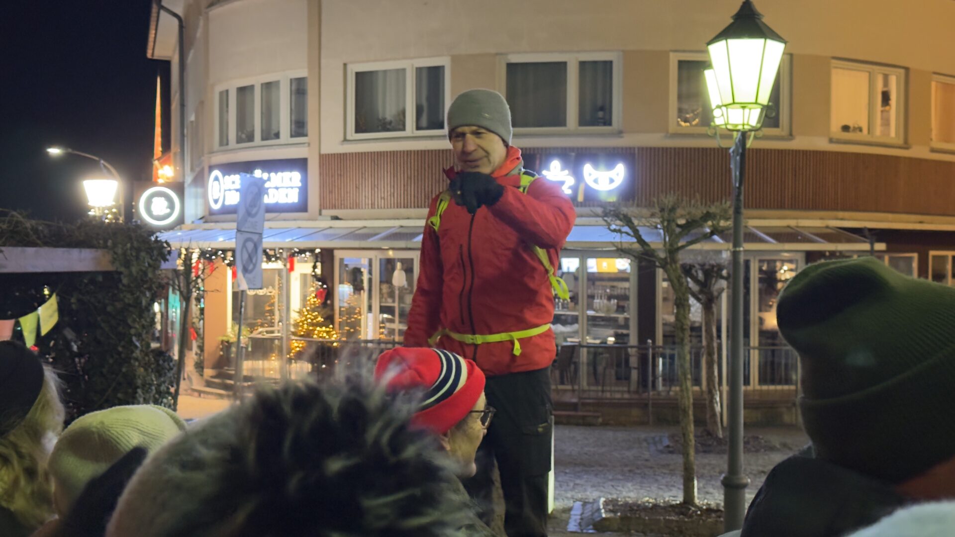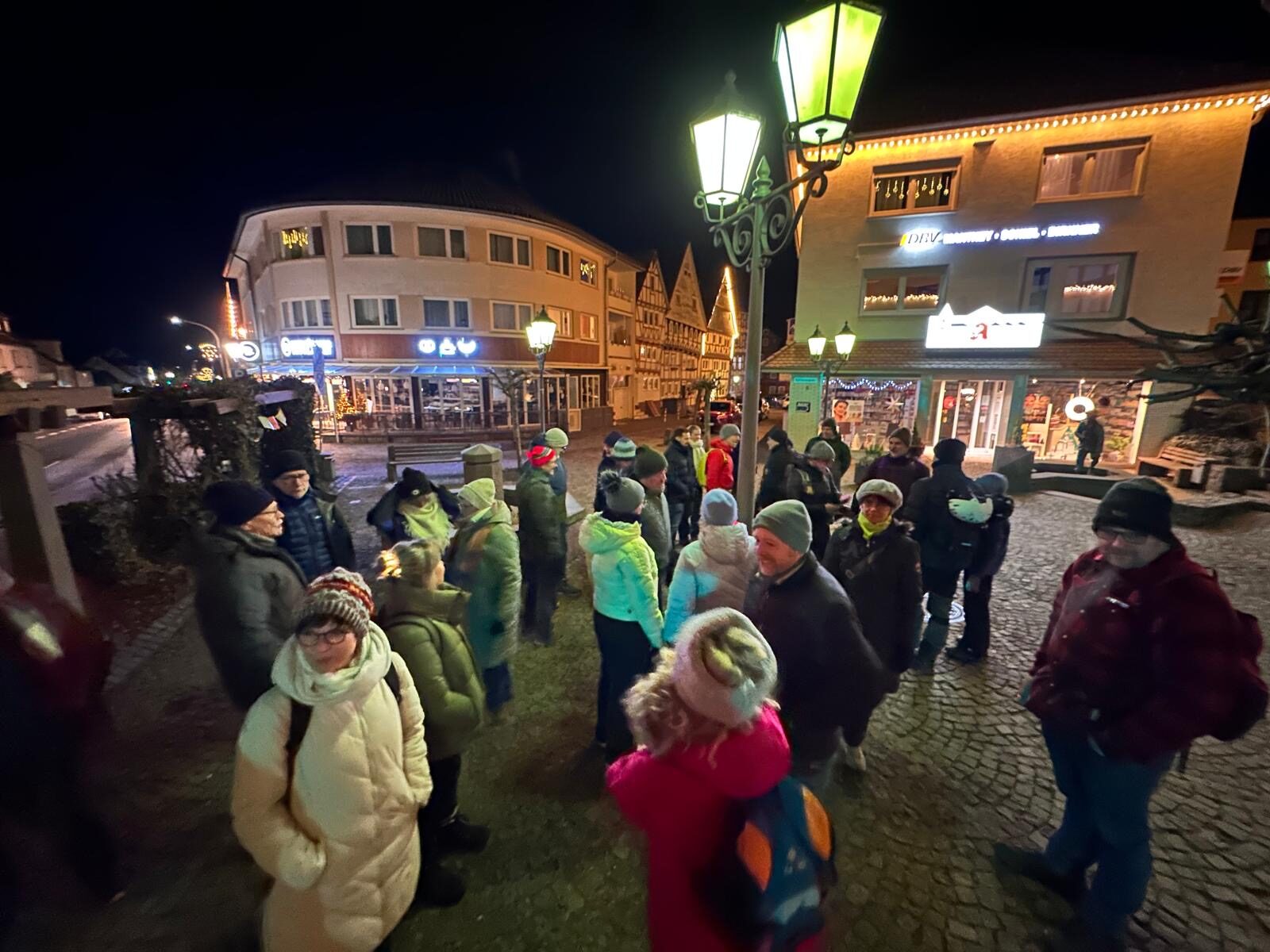Der Raiffeisenplatz in Neukirchen war an diesem Abend deutlich belebter als an den vergangenen Tagen, denn hier trafen wir uns um 18 Uhr zur Glühweinwanderung des KGV Neukirchen. 35 Teilnehmerinnen und Teilnehmer waren gekommen, deutlich mehr als im vergangenen Jahr, was schon beim Ankommen für eine lebendige und erwartungsvolle Stimmung sorgte. Nach einer kurzen Begrüßung durch Wanderführer Rainer Keim setzte sich die Gruppe in Bewegung und verschwand gemeinsam in die kalte, bereits dunkle Winternacht.