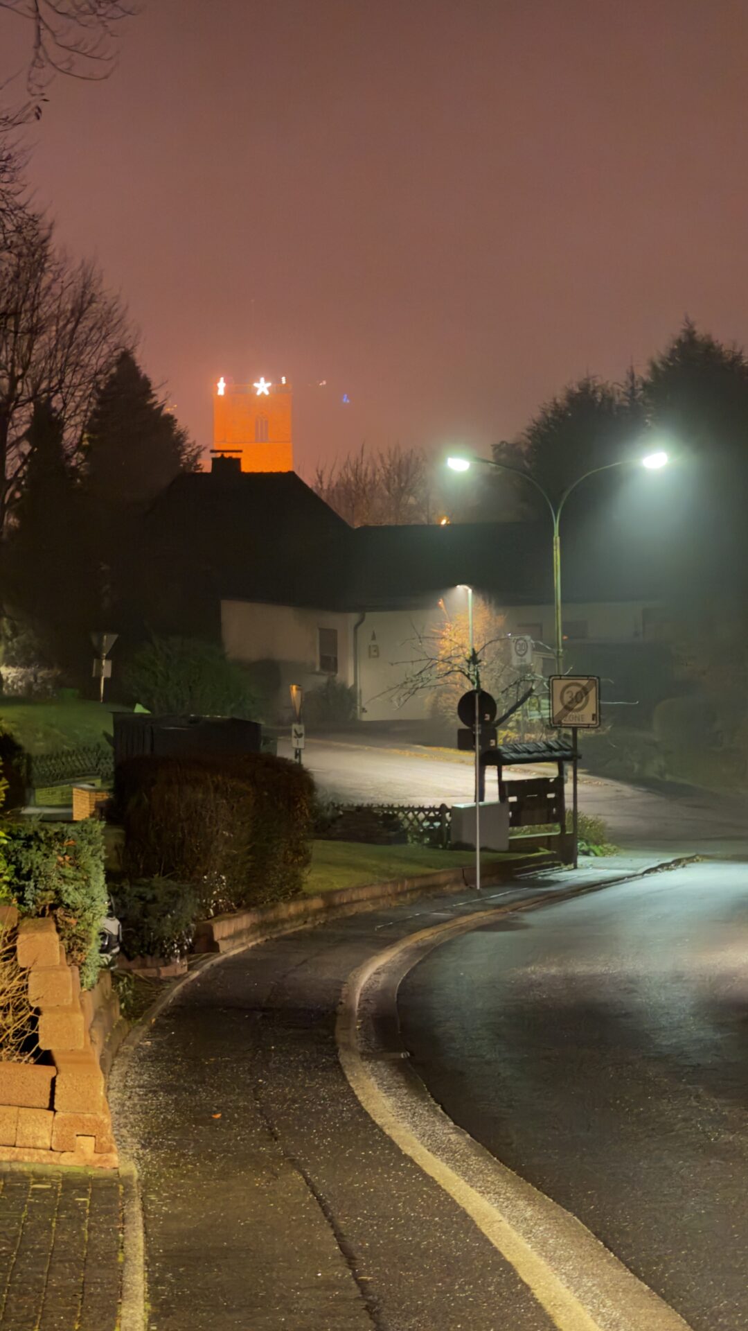 Der Weg führte zunächst durch Neukirchen, vorbei am REWE und an der katholischen Kirche, hinauf zu den Ententeichen oberhalb des Klingelbachs. Es war frostig, aber gut auszuhalten, und der Himmel zeigte sich anfangs noch klar. Auf dem Weg in Richtung Sonnenhof legten wir eine kurze Pause ein. Noch war der Jupiter deutlich zu sehen, auch das Sternbild Orion ließ sich gut erkennen. Martin Diebel nutzte den Moment für einen kurzen Einblick in die Sternenkunde und machte Lust auf die nächste gemeinsame Tour, die Sternenwanderung am 10.01.2026. Lange blieb dafür allerdings nicht viel Zeit. Der Himmel begann sich zu verändern, Nebel zog auf, erst zögerlich, dann immer dichter, bis die Sterne schließlich hinter einer grauen Wand verschwanden.