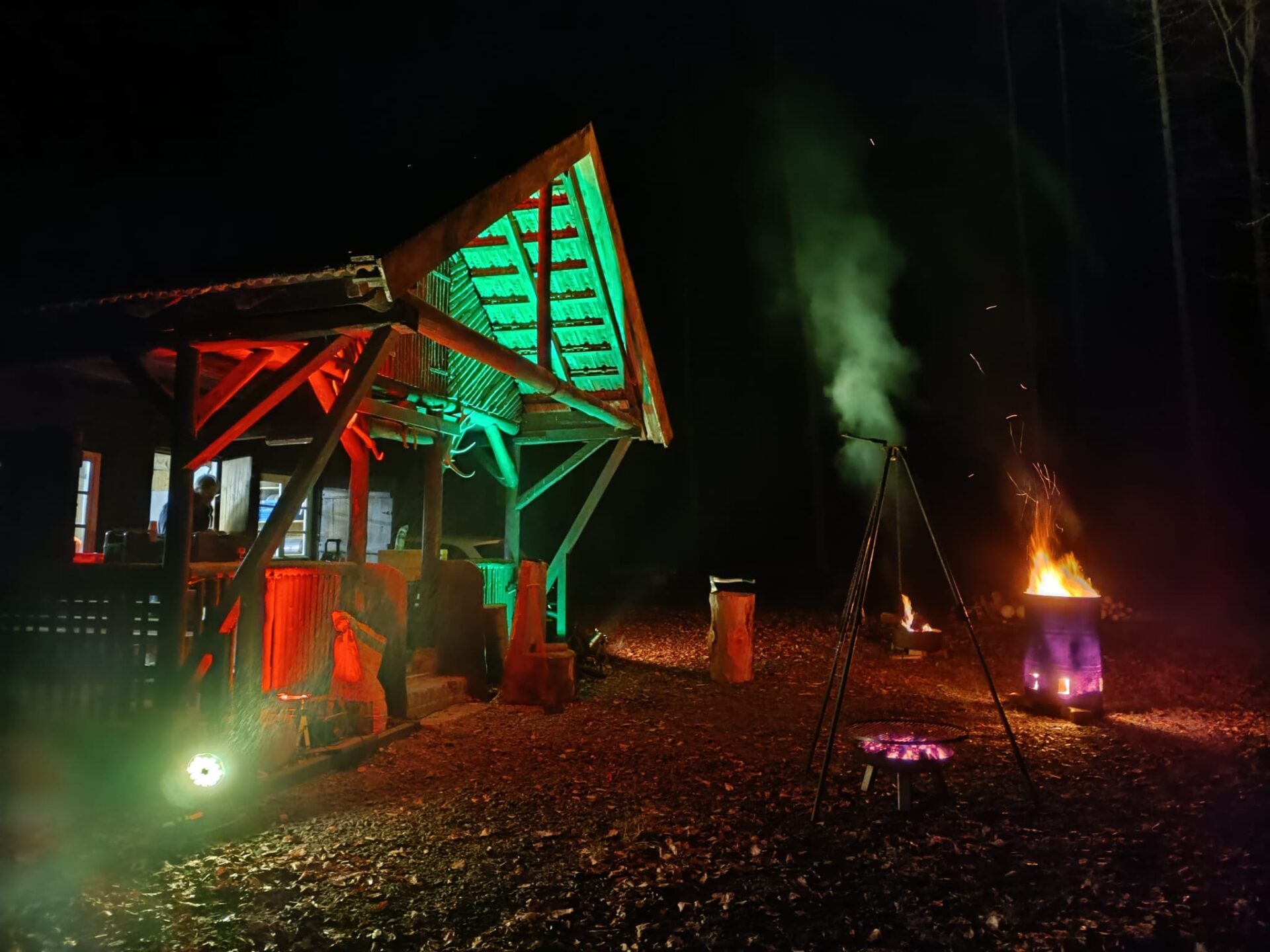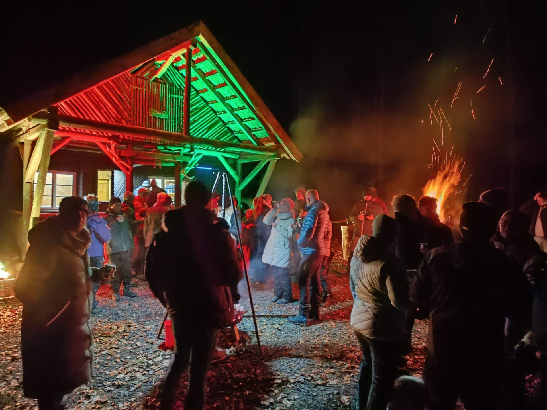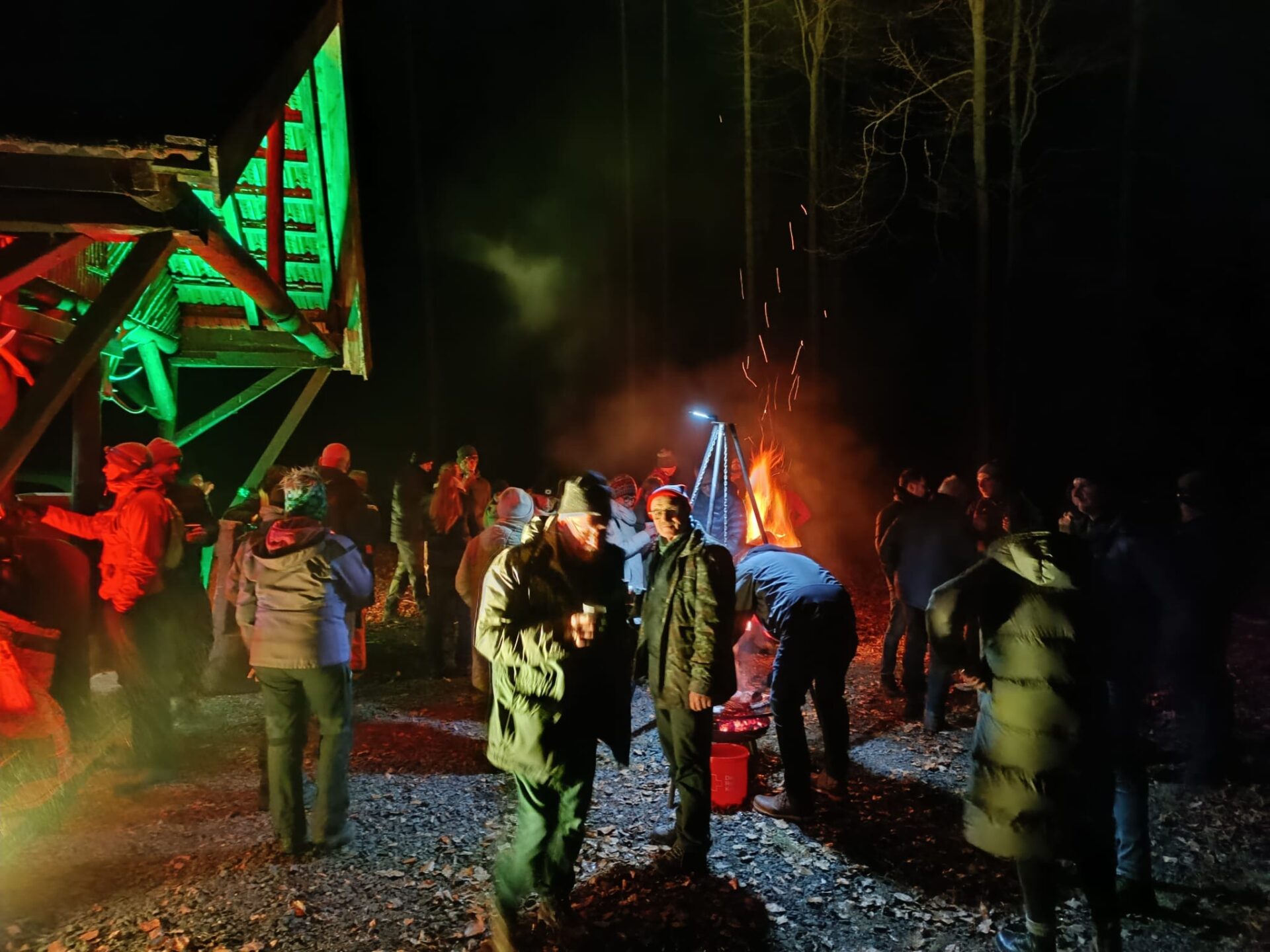 Vorbei an der Thonkuppe, über die Brücke am Angersbach und am Klaushof entlang erreichten wir nach rund 4,5 Kilometern die Schutzhütte des Forstamts. Dort wartete bereits der gemütliche Teil des Abends. Philipp Keim und Reinhard Kohlhase hatten alles vorbereitet. Heißer Apfelwein, eine hervorragend gelungene Feuerzangenbowle, Bier und alkoholfreie Getränke standen bereit. Abgerundet wurde das Ganze durch frisch gegrillte originale Thüringer Bratwürste, die bei den winterlichen Temperaturen genau das Richtige waren.